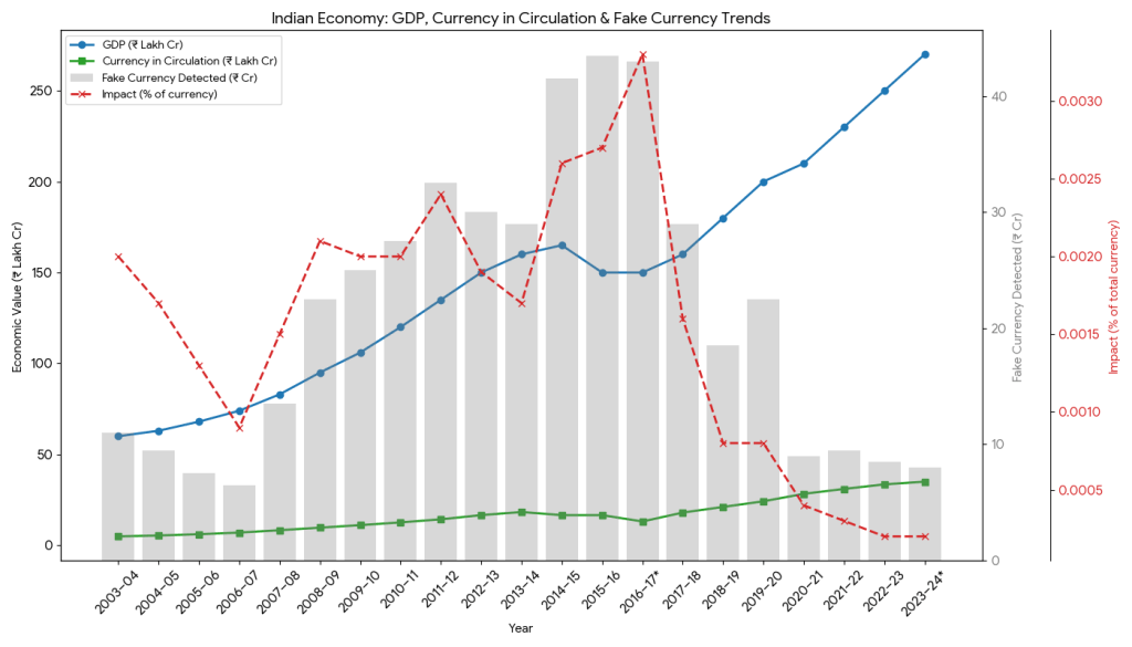 | Year | GDP (₹ Lakh Cr) | Total Currency in Circulation (₹ Lakh Cr) | Fake Currency Detected (No. + ₹ Cr) | Impact (% of currency) |